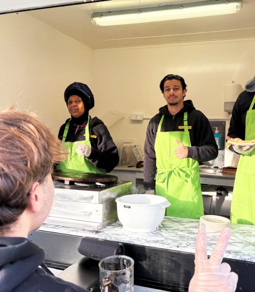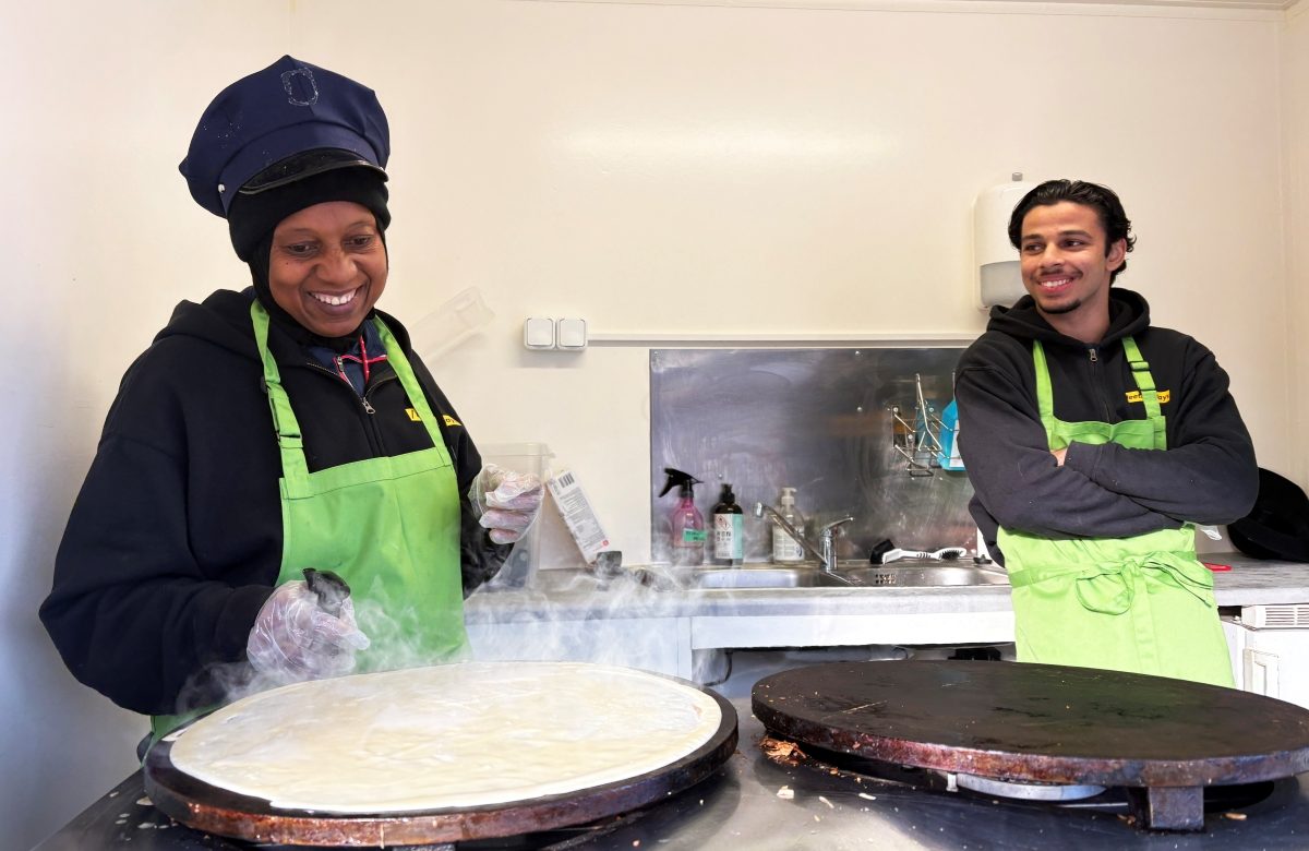 På höstlovet har Salha och Ricardo fullt upp vid stekpannorna. Dom jobbar i Pannkakscaféet som rullar runt i Biskopsgården och serverar gratis pannkakor till folk.